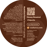Cashews, Peanut and/or Sunflower Oil, Sugar, Salt, Chipotle Pepper, Onion & Garlic Powder, Corn Starch, Brown Sugar, Tomato Powder, Yeast Extract, Natural Smoke Flavors (contains maltodextrin), Citric Acid, Ascorbic Acid, Extractive of Paprika, Honey, Corn Syrup, Xanthan Gum